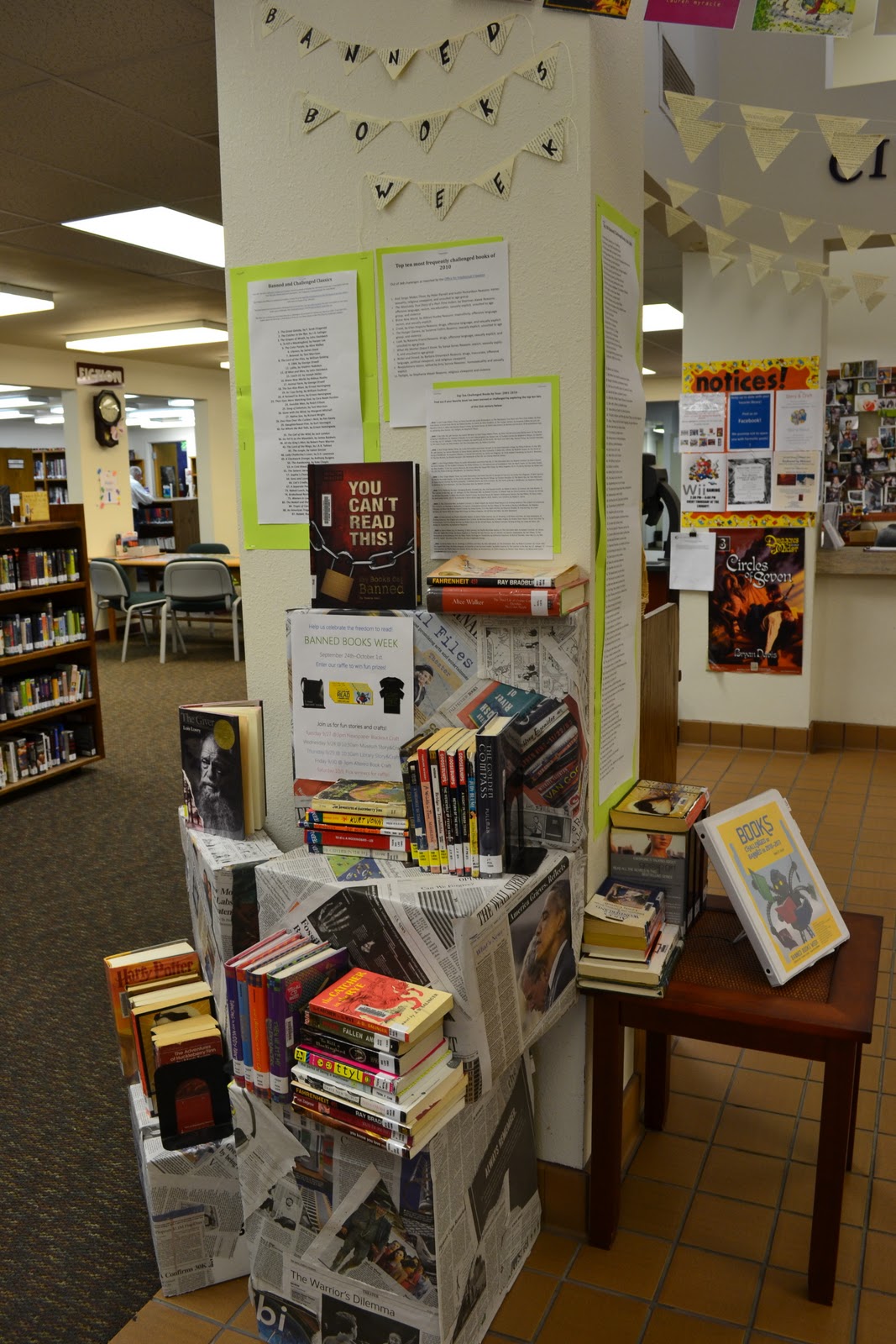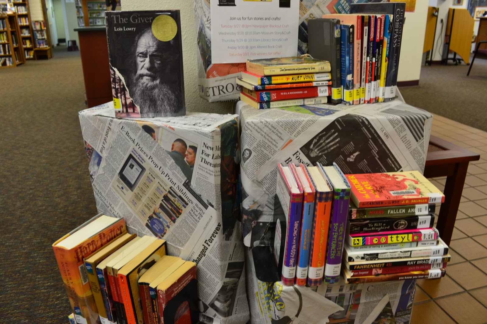 On the hanging card catalog cards I wrote quotes from banned books. I was awarded winner of the “Most Creative Use of Packing Materials” by my fellow librarians. (The tree trunk is made from book packaging). 🙂