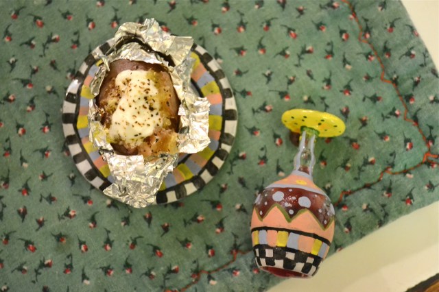 I garnished him with some butter, sour cream, salt and pepper. I accompanied this classic dish with a glass of red wine. (…but actually pomegranate cranberry juice…) As you can see, when I tried to take a pic from above with a bit of background (a potholder) the little glass of red went all drunk and fell over.