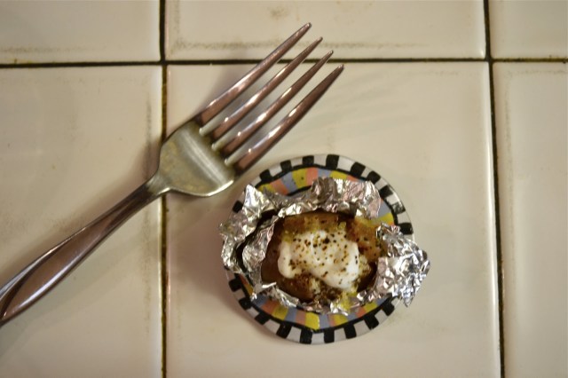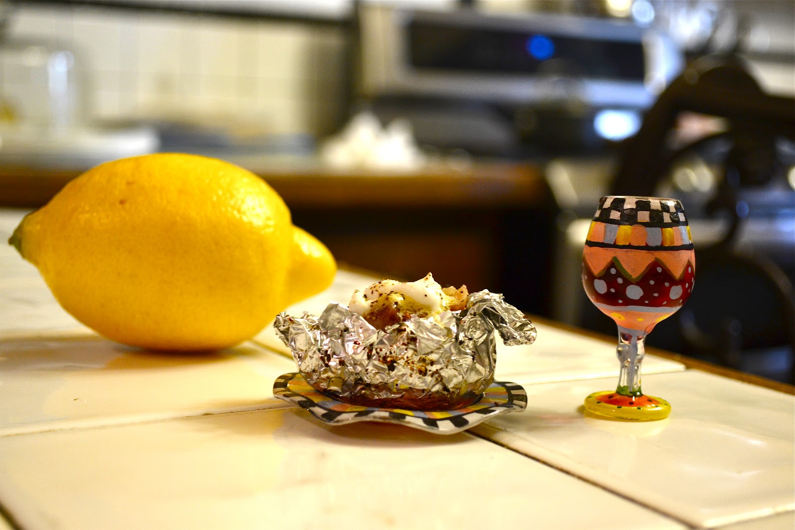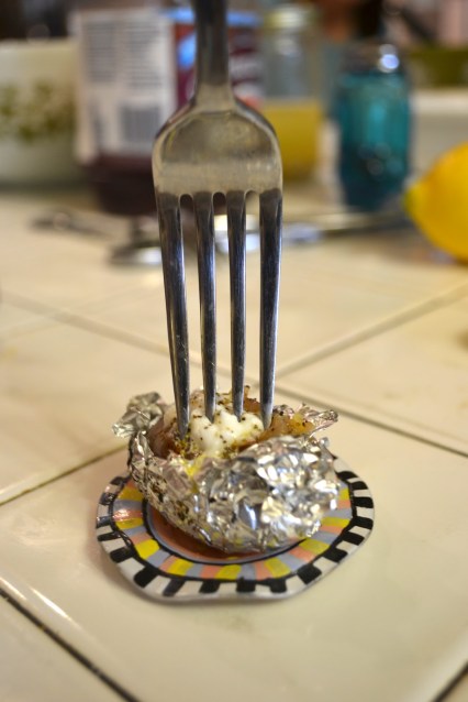 My lovely sister Angelica was cooking up a delicious meal of grilled veggies, pork chops and baked red potatoes for dinner one night. For quite a while I’ve been wanting to make a teeny tiny baked potato, and I seized my opportunity! I wrapped a little tiny dude in some foil and threw him onto the grill with the veggies and pork chops.